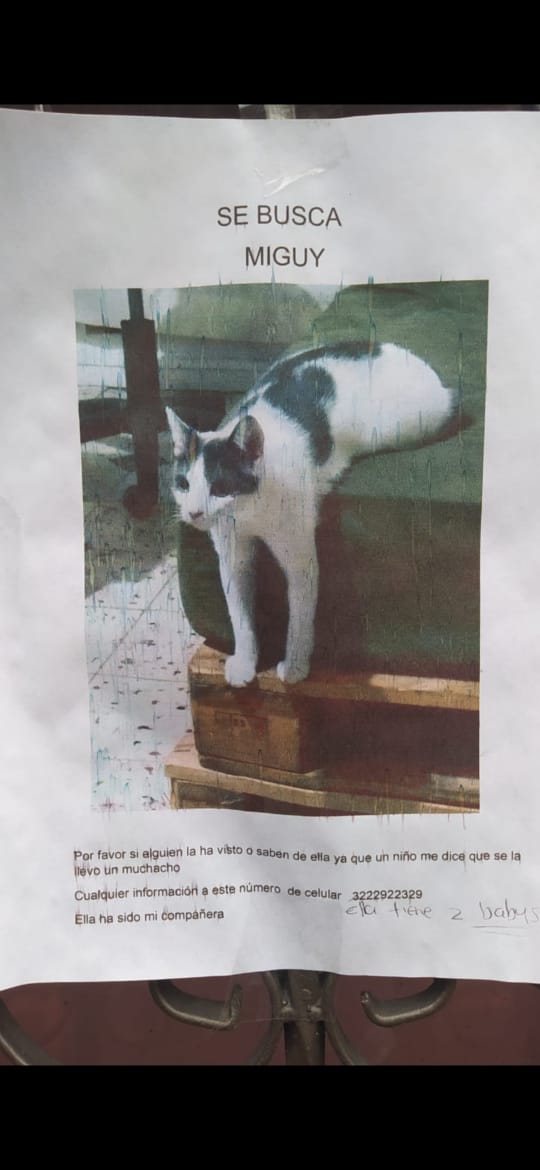 Pero no son casos aislados, es común que los gatos desaparezcan, diversidad de posters pidiendo información se encuentran cada dos cuadras. Hoy apareció Miguy.