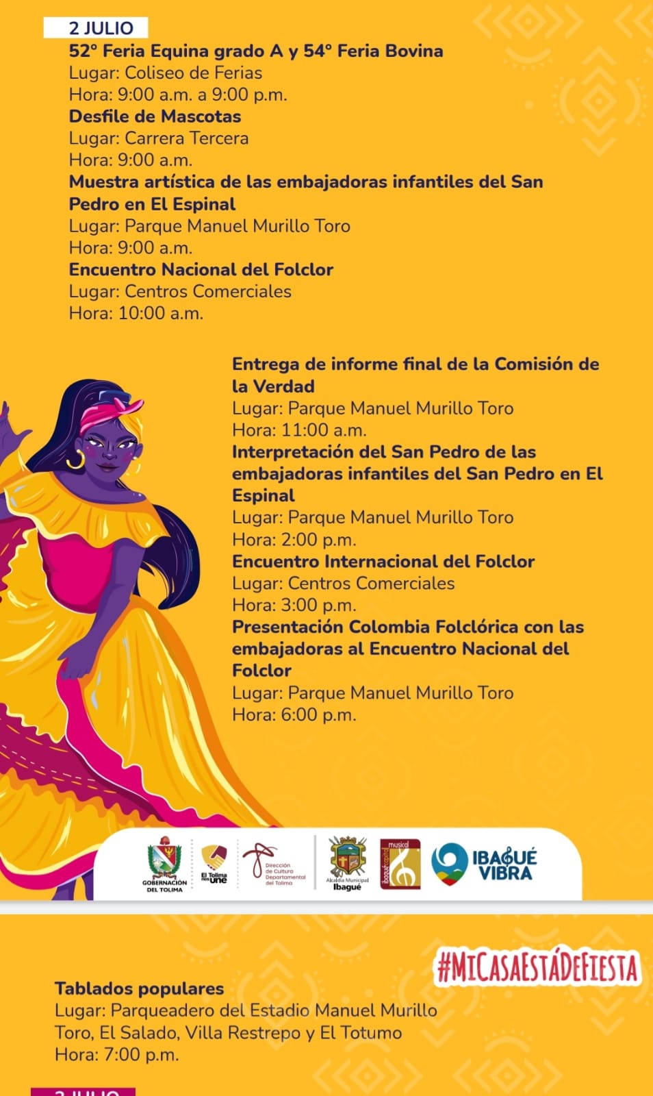 A lo largo de este sábado se realizarán varias actividades en horas de la mañana, como el Desfile de mascotas, el Encuentro Nacional del Folclor, la entrega del Informe Final de la Comisión de la Verdad, la Muestra artística de las Embajadoras Infantiles del San Pedro de El Espinal y la Feria Equina y Bovina, este último hasta las 9:00 pm.