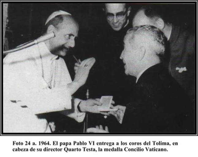 El maestro Quarto Testa ingresaría a dirigir los coros en 1955, continuando su racha de éxitos en Buga, Cali y Neiva. Y parecía inexplicable el hecho de que maestros italianos y de otras latitudes se compenetraran de una manera total con nuestra música popular y con los integrantes de un coro que ya llevaba casi 20 años de trabajo continuo. A partir de 1937 el Conservatorio se llenó de extranjeros que se mantuvieron por mayor o menor tiempo al mando de las masas corales: primero Squarcetta y luego, en los años cuarenta, Ciociano, Bonavolonta, Testa, además del griego Haralambis, y, a partir del 19 de agostode 1955, GuiseppeGagliano. Más adelante los coros serían dirigidos por Alfredo Hering, Vicente Sanchíz, Federico Carier, LajosAltéz, Gregorio Stone, Luis de Salbide, Fritz Voegelin, Giovanny Franco Piva, Leonor Marie Irene Cuykens y Paul Dury.