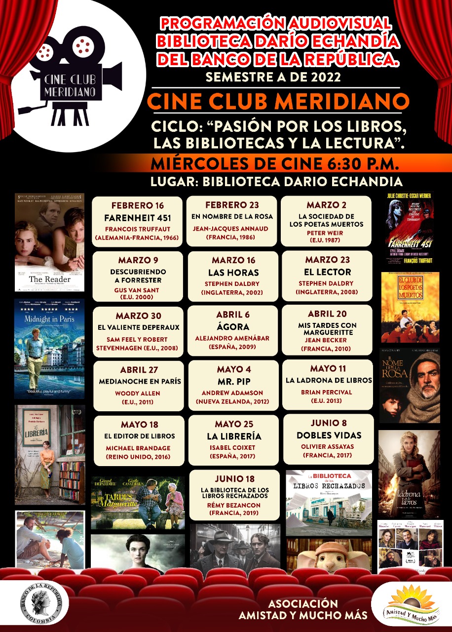 El Cineclub Meridiano, con el apoyo de la Asociación amistad y mucho más, estará a cargo de realizar el ciclo audiovisual “Pasión por los libros, las bibliotecas y la lectura” que se llevará a cabo cada miércoles a las 6:30 pm en la Biblioteca Darío Echandía.