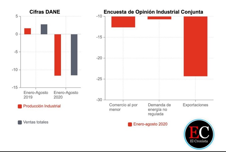 Pero eso no es todo, de acuerdo con los resultados de la Encuesta Manufacturera del DANE, se logró hacer la siguiente comparación: para el periodo enero-agosto 2019 la producción industrial era de 1,7% y 2,8% en las ventas totales, mientras que en el mismo periodo del 2020 las tasas son de -11,6% y -11,5% respectivamente.
