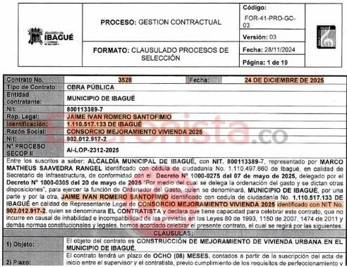 En este caso, el Contrato No. 3528 del 24 de diciembre de 2025 fue adjudicado al Consorcio Mejoramiento Vivienda 2025, que igualmente tiene como representante legal a Jaime Iván Romero Santofimio y está conformado por: