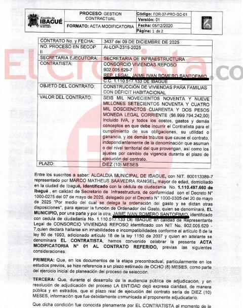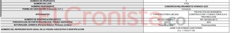 En total, ese mismo representante legal, Jaime Iván Romero Santofimio termina vinculado a tres adjudicaciones: dos relacionados con el mejoramiento de vivienda y uno con la construcción de vivienda de interés prioritario.