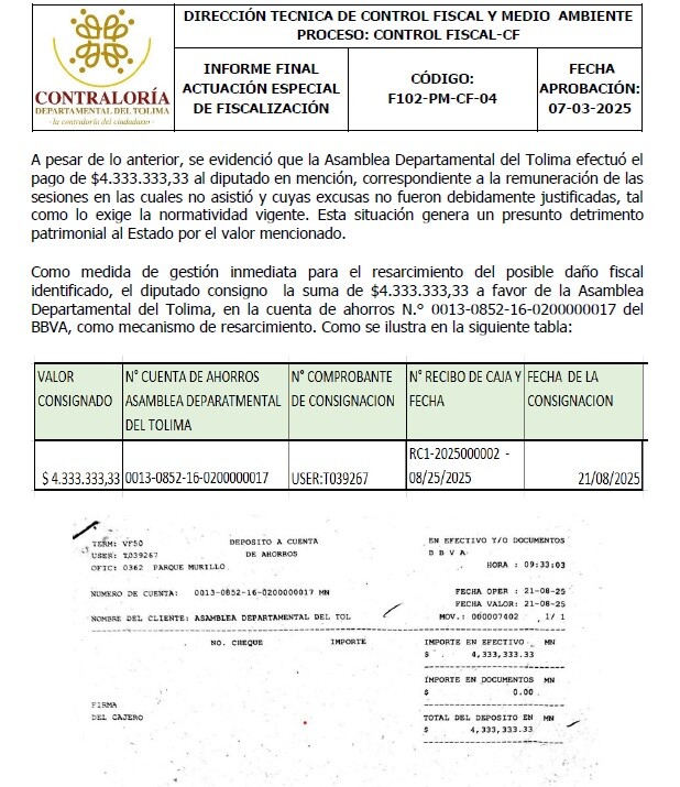 Pese a estas ausencias, la Asamblea Departamental del Tolima realizó pagos por un total de $4.333.333,33, lo que configuraría un presunto daño patrimonial. El informe señala que dicho monto fue reintegrado únicamente cuando el diputado fue informado formalmente por la Contraloría, quien devolvió el dinero de manera voluntaria a la cuenta de la corporación.