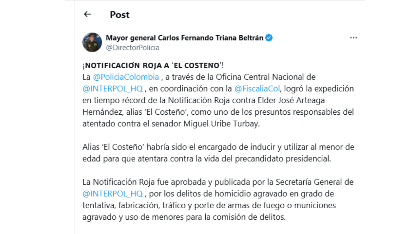 Hace apenas 24 horas la Policía había conseguido la Notificación Roja de Intepertol para rastrear a 'El Costeño', incluso fuera del país. Sin embargo, su captura se produjo en la madrugada de este sábado en la localidad de Engativá, en el occidente de Bogotá, donde al parecer se escondía desde que ocurrió el atentado.