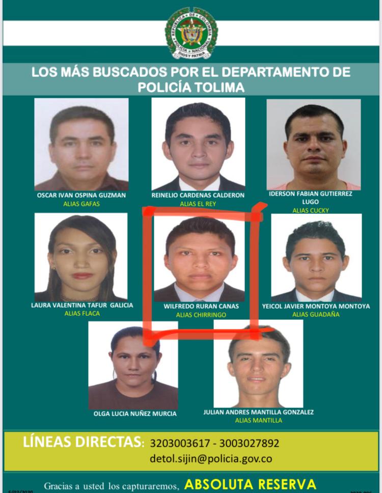 Alias Chirringo fue dejado a disposición de la Policía Tolima, posteriormente ante el Juez Sexto municipal de garantías de Ibagué, por los delitos de homicidio agravado, fabricación, tráfico o porte de armas de fuego, además se encuentra en un proceso de judicialización de disidencias del extinto frente 25 de las Farc.