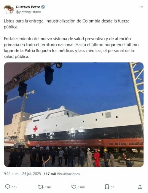 El presidente Gustavo Petro anunció que los tres buques que fueron lanzados al agua este jueves 24 de julio, en el marco del aniversario 202 de la Armada Nacional, deben ser el fundamento para fortalecer la reforma a la salud con el enfoque de prevención.