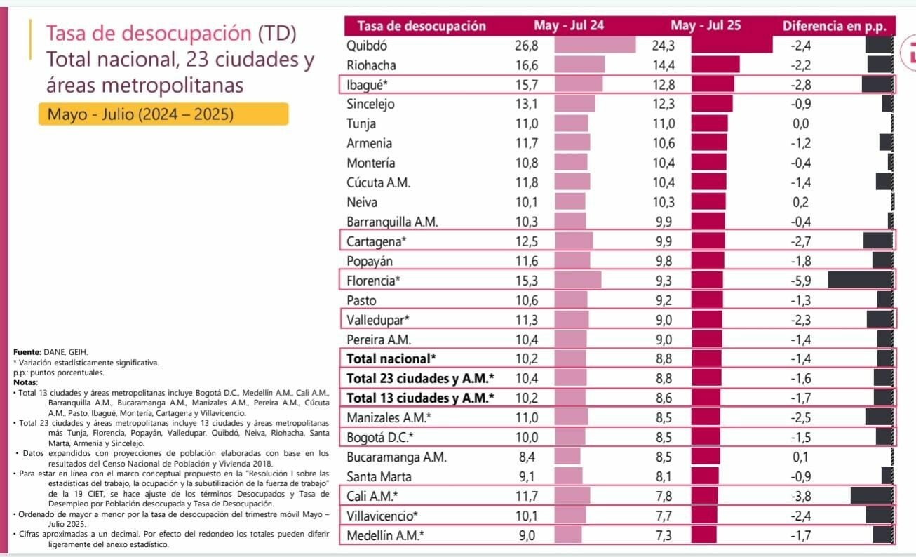 Las esperanzadoras cifras que arrojó el Dane sobre el mercado laboral en Ibagué al parecer van en sintonía con lo que ocurre en el resto del país. Según el Dane, en el reciente mes de julio la tasa de desocupación nacional fue de 8,8 %. Se redujo 1,1 puntos porcentuales en comparación con el mismo mes de 2024.