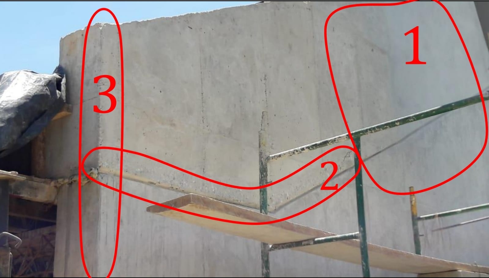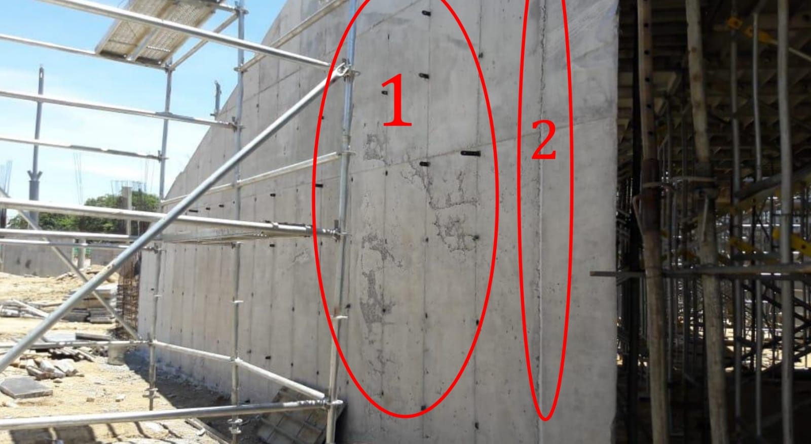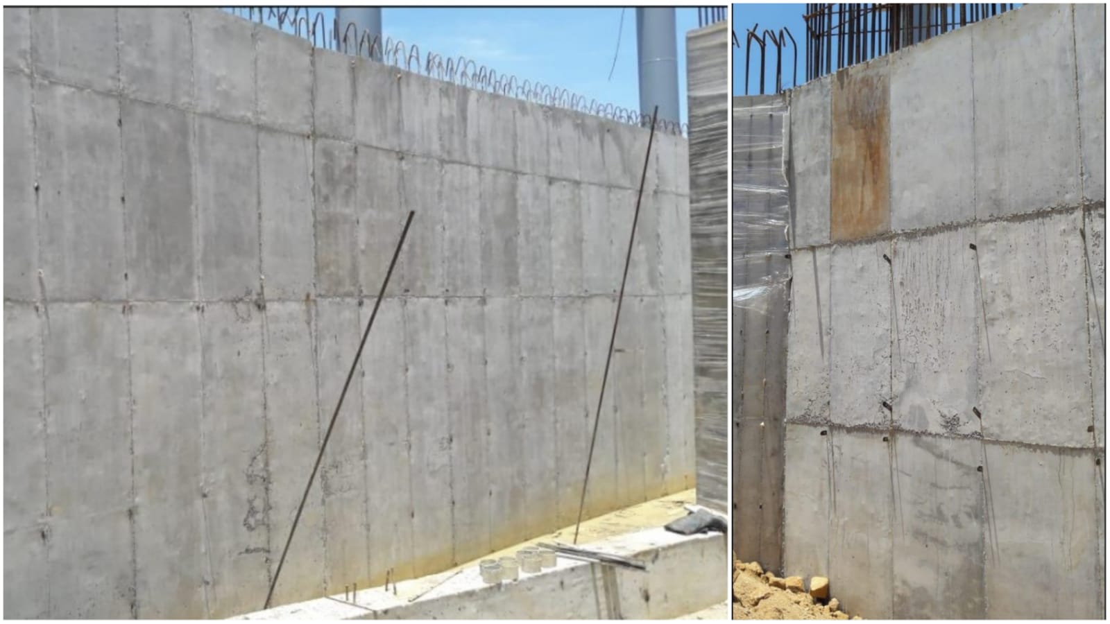 • Claramente las juntas de los tableros de las formaletas metálicas, existen hormigueros, distintos relieves en toda la superficie del muro, distintas tonalidades del concreto, perforaciones generadas por la formaleta metálica que están empleando, la textura presenta sobresaltos y áreas rugosas.