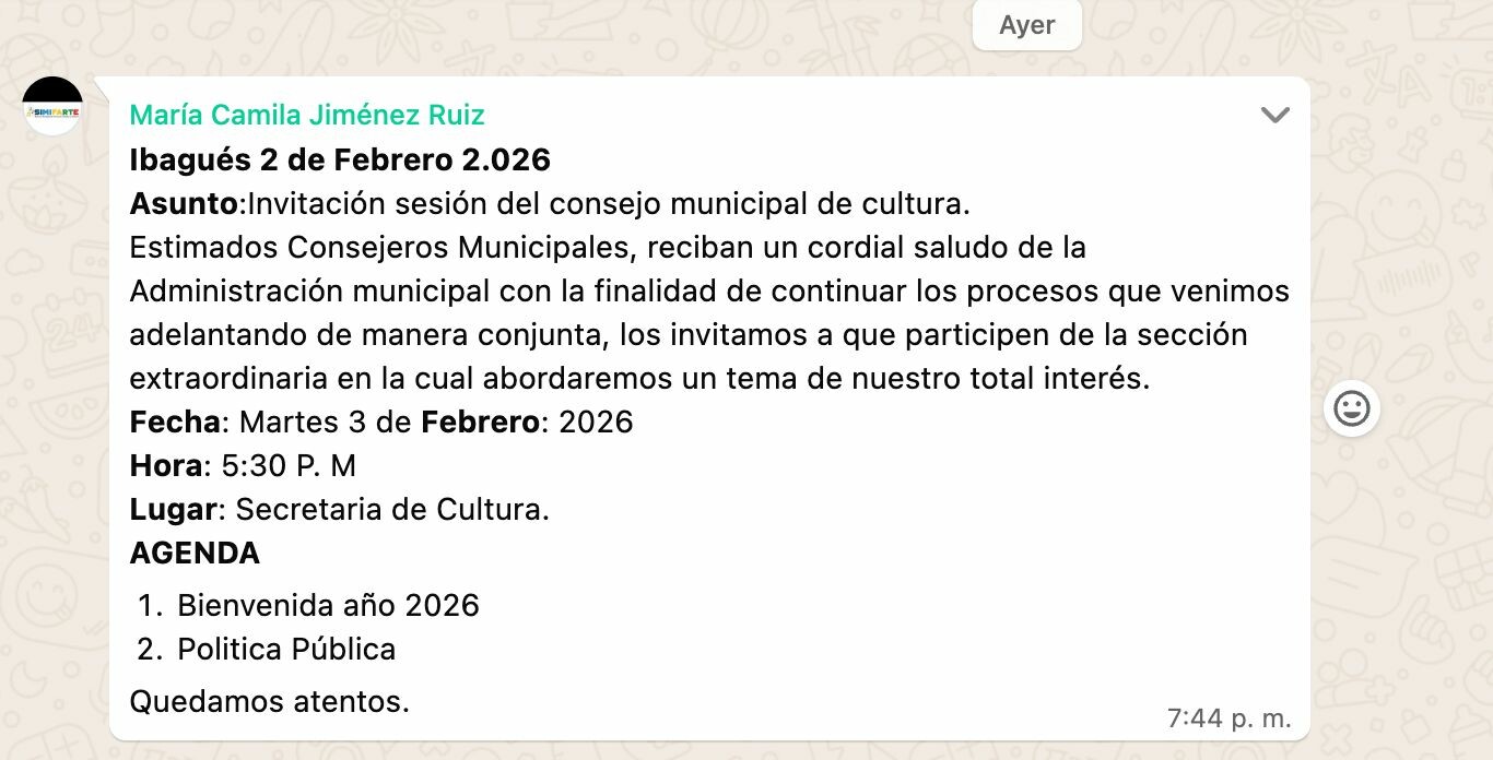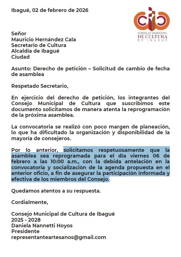La Alcaldía de Ibagué convocó el pasado 30 de enero al Concejo de Ibagué para la presentación del proyecto de acuerdo de la Política Pública de Cultura de la ciudad. No obstante, según denuncias de consejeros y actores del sector cultural, el documento no habría sido socializado previamente ante el Consejo Municipal de Cultura de Ibagué antes de llegar al cabildo municipal.