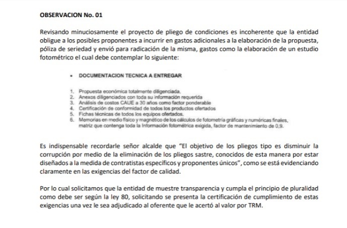 “Es indispensable recordarle señor alcalde que ‘El objetivo de los pliegos tipo es disminuir la corrupción por medio de la eliminación de los pliegos sastre, conocidos de esta manera por estar diseñados a la medida de contratistas específicos y proponentes únicos’, como se está evidenciando claramente en las exigencias del factor de calidad”, acotó la Constructora.