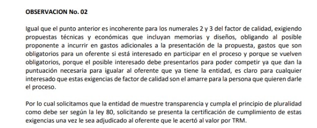 Según otra de las observaciones, se pidieron memorias y diseños dentro de las propuestas técnicas y económicas, gastos en los que es necesario incurrir de manera previa, si se quiere competir en el factor de calidad. “Es claro para cualquier interesado que estas exigencias de factor de calidad son el amarre para la persona que quieren darle el proceso”, aseveró Rito Acosta.