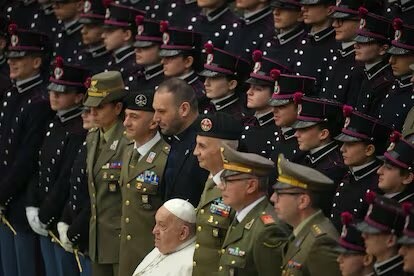 Imagen #11: La imagen más resiente. El papa Francisco posa con miembros de las fuerzas armadas y cadetes, al final de su audiencia general semanal en el Aula Pablo VI, en el Vaticano, el miércoles 12 de febrero de 2025.