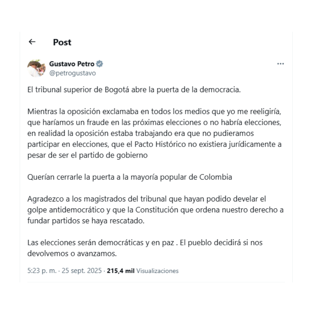 “El Tribunal Superior de Bogotá abre la puerta de la democracia. Mientras la oposición exclamaba en todos los medios que yo me reeligiría, que haríamos un fraude en las próximas elecciones o que no habría elecciones, en realidad la oposición estaba trabajando para que no pudiéramos participar en elecciones, para que el Pacto Histórico no existiera jurídicamente, a pesar de ser el partido de gobierno”, escribió Petro a propósito de la decisión del Tribunal.
