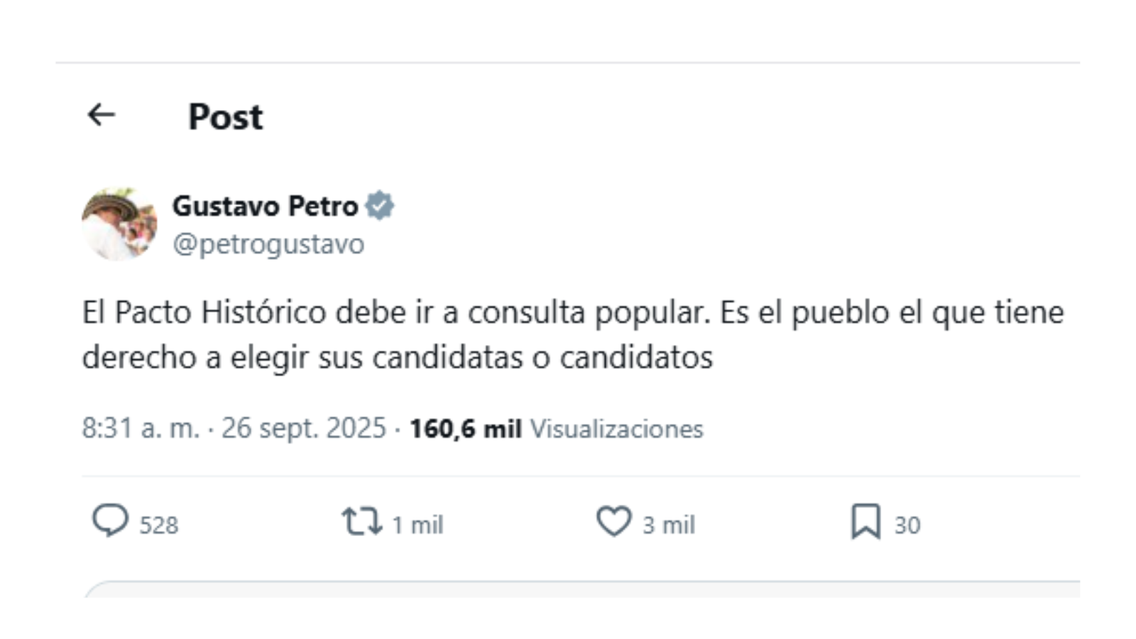 A través de su cuenta personal de X, Petro manifestó su deseo de que los movimientos de izquierda o progresistas reunidos en el Pacto Histórico elijan a sus candidatos a la Presidencia, Senado y Cámara de Representantes mediante consultas abiertas en las que todos los colombianos puedan votar.