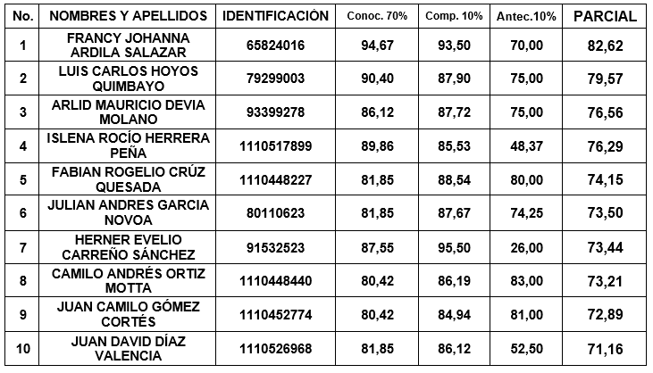 De acuerdo con la resolución 239 del 30 de septiembre de 2021, se conocieron los puntajes de los tres primeros aspirantes, y encabeza la lista, precisamente la actual personera encargada, Franci Johana Ardila Salazar, con 94,67 por ciento, le sigue el ex jefe de la oficina jurídica de Cortolima, Luis Carlos Hoyos Quimbayo, con 90,40 puntos y, en tercer lugar, Islena Rocío Herrera Peña, ex personera de Flandes con 89,06 puntos.