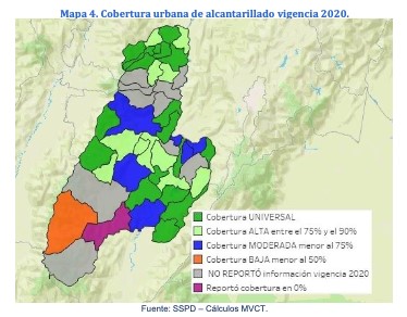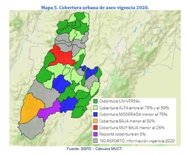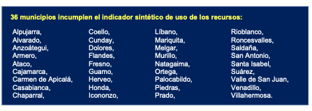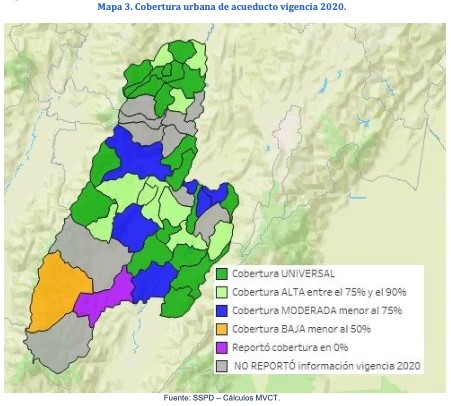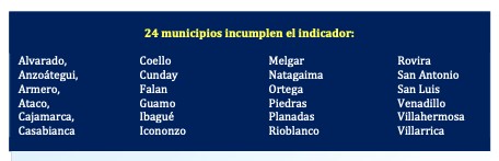 De los 47 municipios solamente 17 reportaron cobertura universal, 12 municipios cobertura alta, 5 cobertura moderada, Rioblanco reportó una cobertura baja, Ataco reportó un 0% y 10 municipios no reportaron. Para Ibagué el dato entregado por el informe del Ministerio de Vivienda clasifica a la ciudad con una cobertura muy baja.
