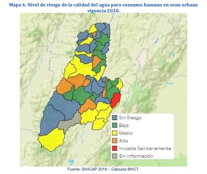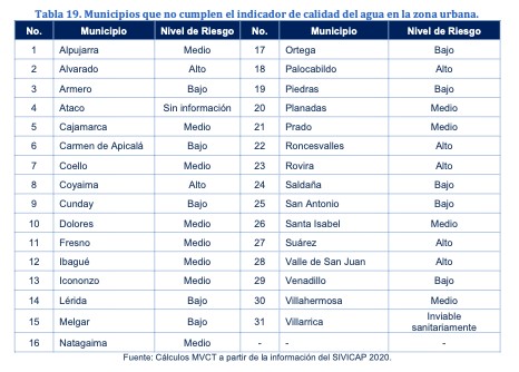 Los resultados del nivel de riesgo de la calidad del agua para consumo humano en los municipios del departamento del Tolima, vigencia 2020 muestran que Villarrica es inviable sanitariamente, 7 municipios tienen un riesgo alto, 12 -inculido Ibagué- tienen un riesgo medio, Ataco no reportó información, y 16 municipios no tienen riesgo de la calidad de agua para consumo en la zona urbana en el año 2020.