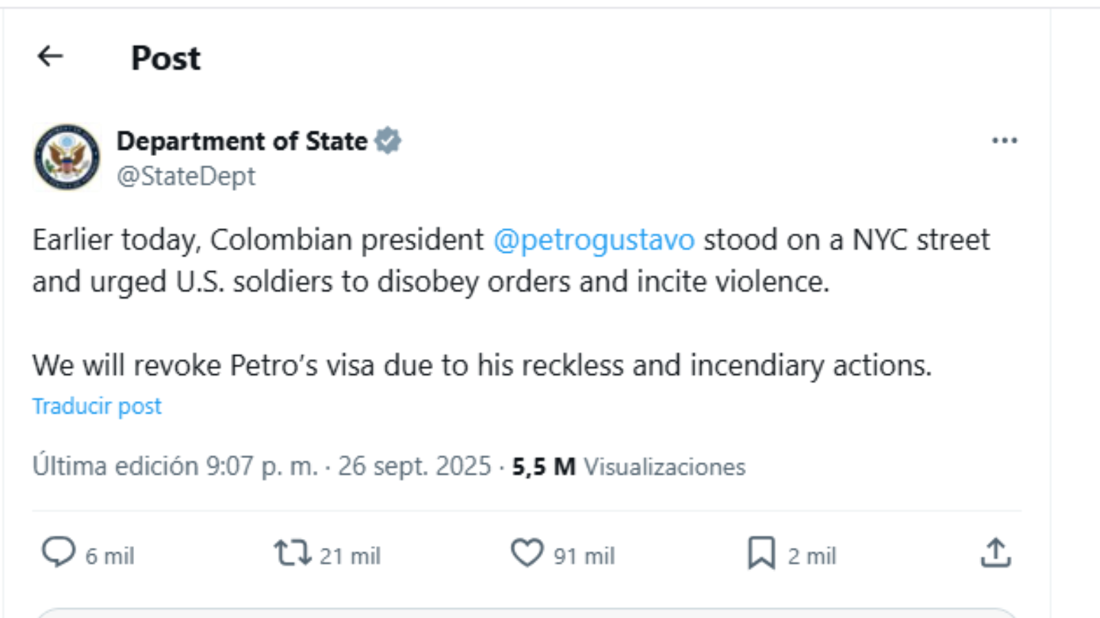 "Más temprano hoy, el presidente de Colombia, Gustavo Petro, apareció en una calle de Nueva York, donde públicamente instó a los soldados estadounidenses a desobedecer órdenes e incitar a la violencia. Como resultado de estas acciones imprudentes e incendiarias, procederemos a revocar la visa del presidente Petro", informó el Departamento de Estado.