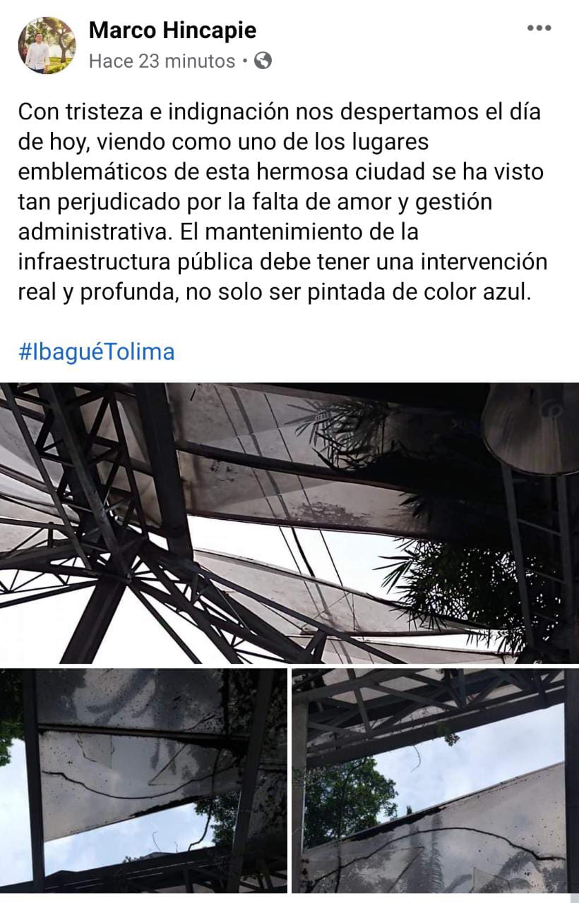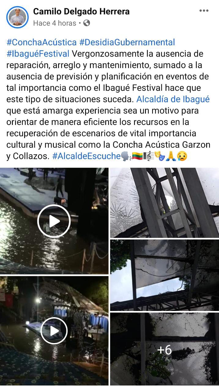 "Vergonzosamente la ausencia de reparación, arreglo y mantenimiento, sumado a la ausencia de previsión y planificación en eventos de tal importancia como el Ibagué Festival hace que este tipo de situaciones suceda", esgrimió Camilo Delgado, exconcejal y excandidato a la Alcaldía.