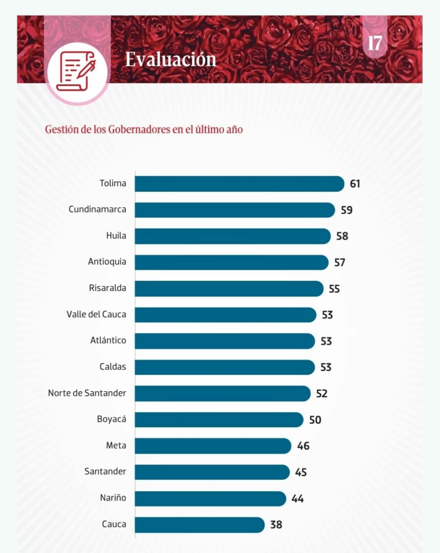 La gobernadora del Tolima superó a otros gobernadores de departamentos importantes como Cundinamarca (59 %), Huila (58 %), Antioquia (57 %) y Risaralda (55 %).