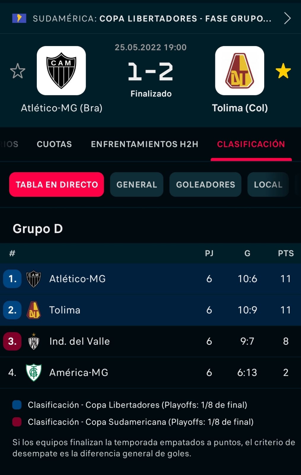 Deportes Tolima, con los mismo puntos que América Mineiro clasifican a la siguiente ronda, Independiente del Valle recala en Copa Sudamericana y América Mineiro queda eliminado.