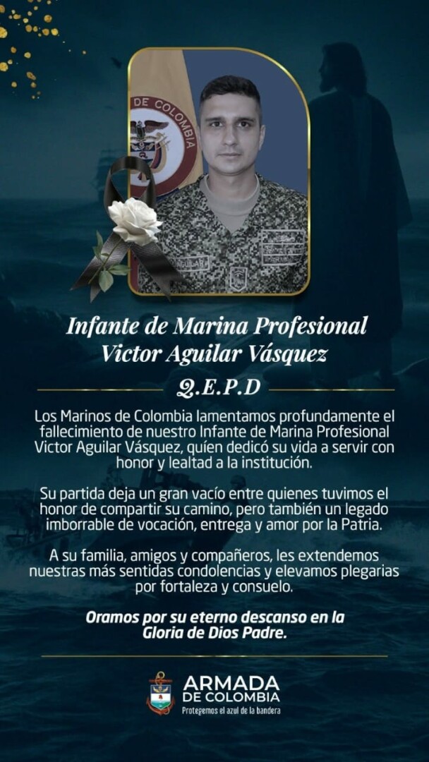 "Su partida deja un gran vacío entre quienes tuvimos el honor de compartir su camino, pero también un legado imborrable de vocación, entrega y amor por la Patria. A su familia, amigos y compañeros, les extendemos nuestras más sentidas condolencias y elevamos plegarias por fortaleza y consuelo", expresó la Armada Nacional.