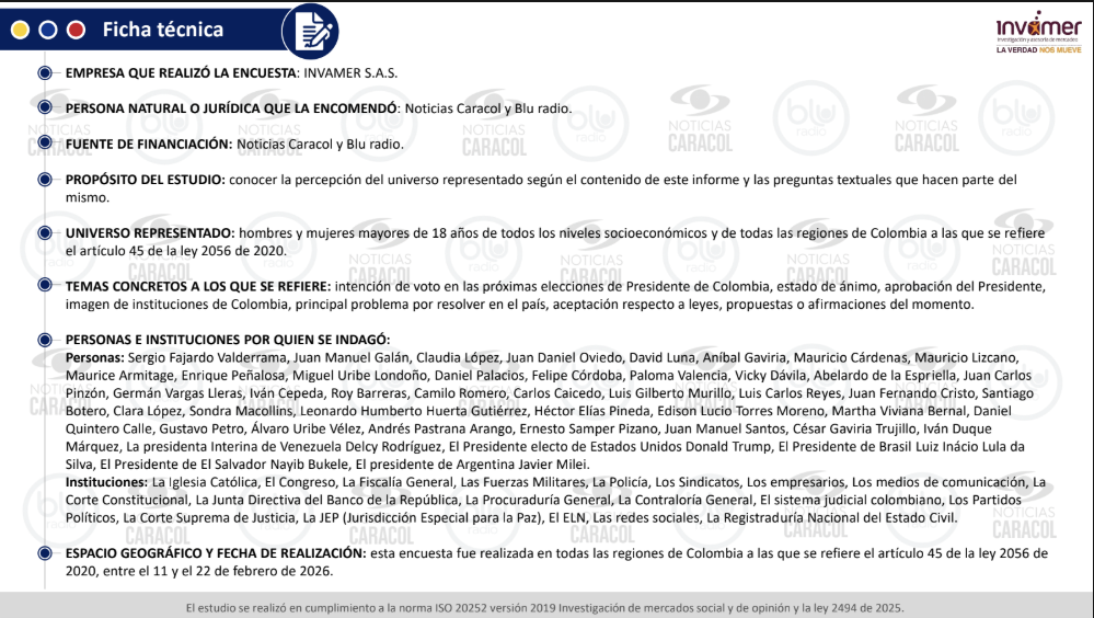 La encuesta fue realizada por Invamer S.A.S entre los días 11 y 22 de febrero con una muestra de 3.800 encuestas en 147 municipios del país y un margen de error de 1,93%.