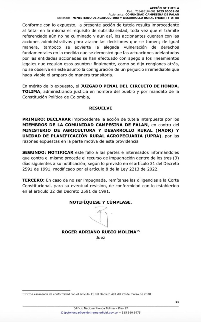 Un juez del Juzgado Penal del Circuito de Honda declaró improcedente la acción de tutela interpuesta por más de mil campesinos de Falan, en el norte del Tolima, contra el Ministerio de Agricultura y Desarrollo Rural y la Unidad de Planificación Rural Agropecuaria (UPRA), relacionada con el proceso de declaratoria de las Áreas de Protección para la Producción de Alimentos (APPA).