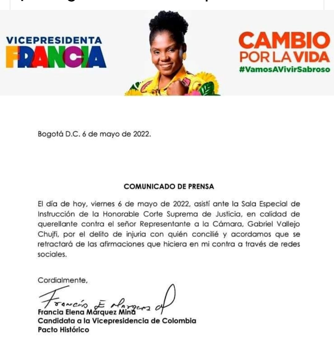 Luego de haber llegado a un acuerdo conciliatorio, quiero expresar que no puedo afirmar que Francia Márquez tenga vínculos con el ELN ni con ningún grupo terrorista al margen de la ley. Pido excusas públicas a ella por los perjuicios ocasionados con mis afirmaciones.