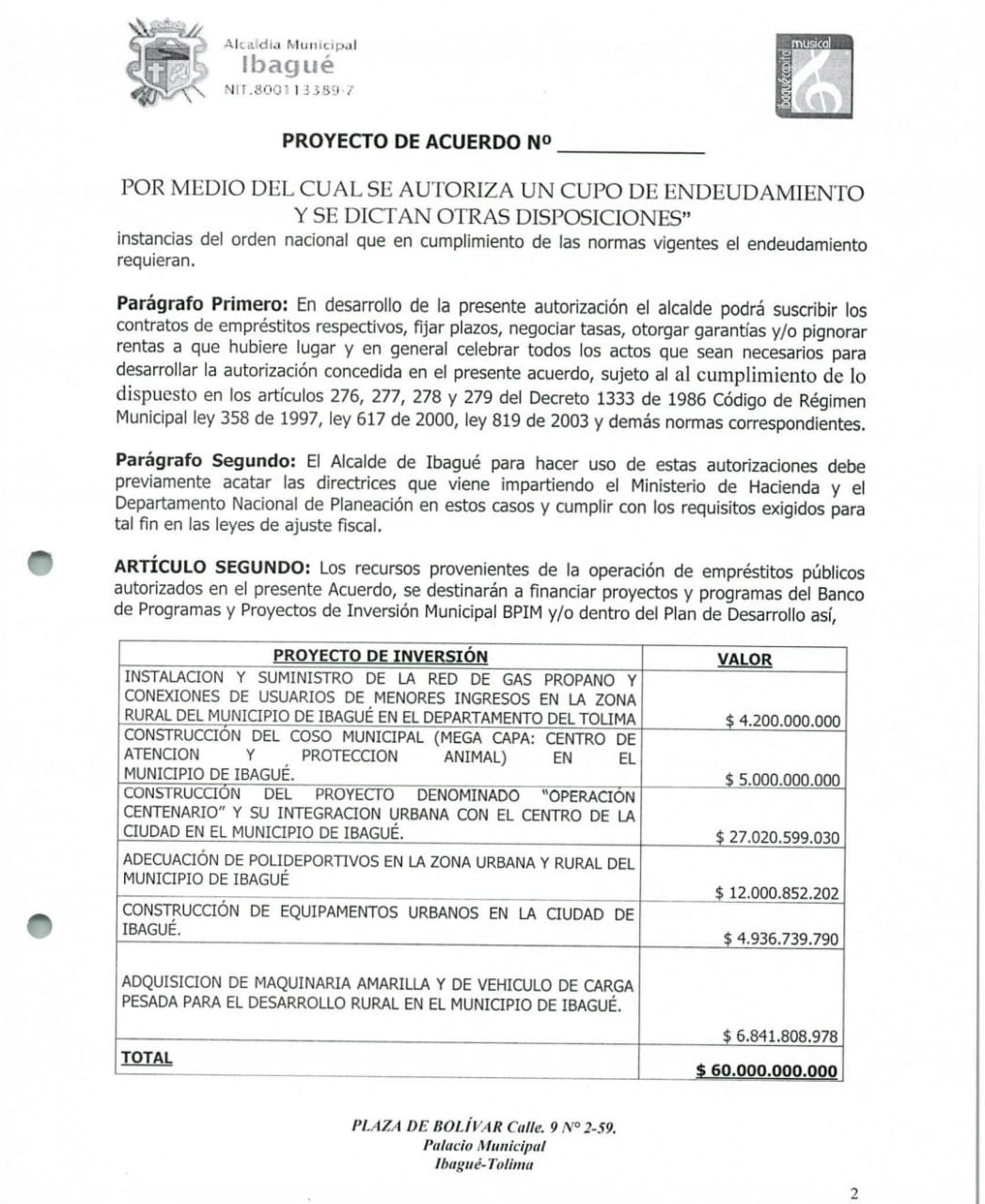 El alcalde Andrés Hurtado radicó el proyecto de Acuerdo con el cual busca que el Concejo de Ibagué le amplíe el cupo de endeudamiento, y así, pedir otro empréstito, en esta ocasión por $60.000 millones.