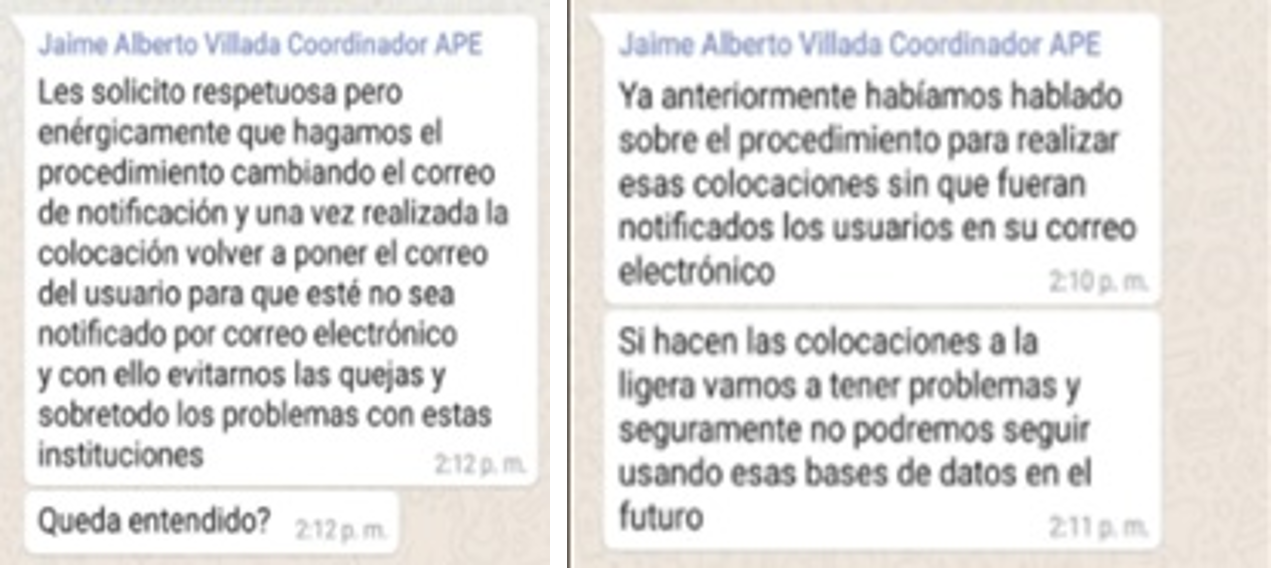 Entonces, la modalidad empleada fue la de hacer aparecer gente como colocada sin que esas personas se enteraran, como queda en evidencia en esta cadena de mensajes de WhatsApp donde se pide que se reporte las colocaciones, como si hubieran sido de la APE sin que se notifique a los colocados, incluso hubo una persona que se enteró de que su nombre había sido utilizado sin su consentimiento, lo cual le valió para llevar el caso a la Fiscalía.