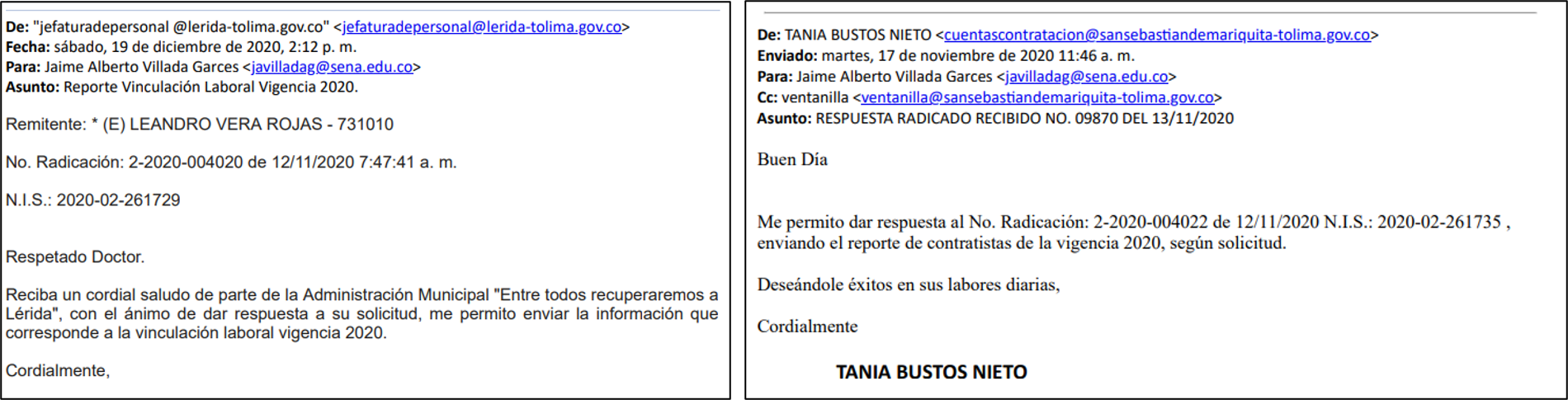 El Cronista.co entrevistó a Tania Bustos, profesional universitaria que labora en la oficina de contratación de la alcaldía de Mariquita. Ella, el 17 de noviembre de 2020 en cumplimiento de una solicitud que hace el Coordinador de la APE Sena Tolima, le responde en los siguientes términos: Me permito dar respuesta al No. Radicación: 2-2020-004022 de 12/11/2020 N.I.S.: 2020-02-26173, enviando el reporte de contratistas de la vigencia 2020, según solicitud.