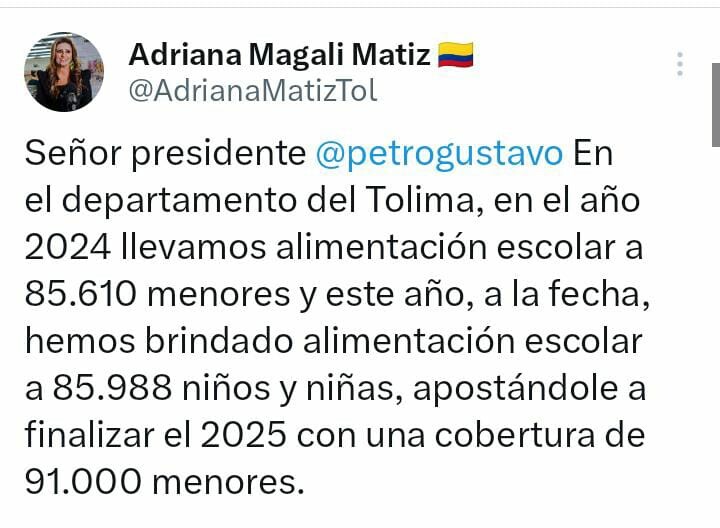 A través de su cuenta personal de X, la mandataria publicó un extenso hilo en el que defendió la gestión de su gobierno con el Programa de Alimentación Escolar (PAE) e intentó desmentir que en el Tolima “se roban” los recursos destinados a la niñez, como lo aseguró Petro.