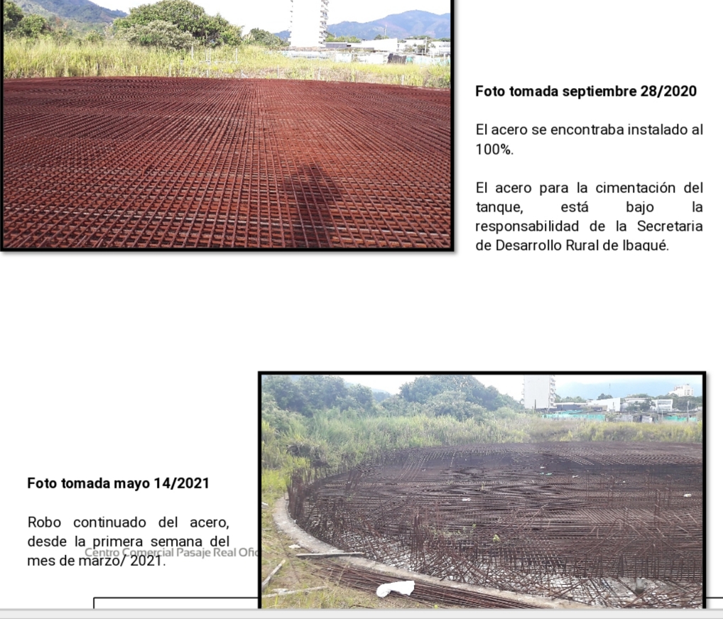 Según documentos recopilados por la veeduría Agua para Ibagué, el nueve de marzo del presente año, el señor Jorge Triana Soto, representante legal del Consorcio Atria 2015, contratista de obra para el tanque de almacenamiento agua potable Fiscalía, radicó documento en el que evidenciaba con registro fotográfico de por medio, el hurto continuo de los aceros que forman parte de la cimentación para el mencionado tanque.