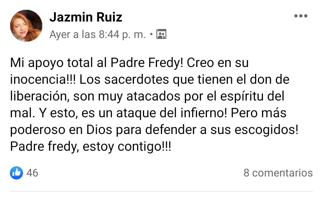 "Mi apoyo total al Padre Freddy. ¡Creo en su inocencia! Los sacerdotes que tienen el don de liberación, son muy atacados por el espíritu del mal. Y esto, es un ataque del infierno. Pero más poderoso en Dios para defender a sus escogidos. Padre Freddy, estoy contigo", comentó Jazmin Ruiz.