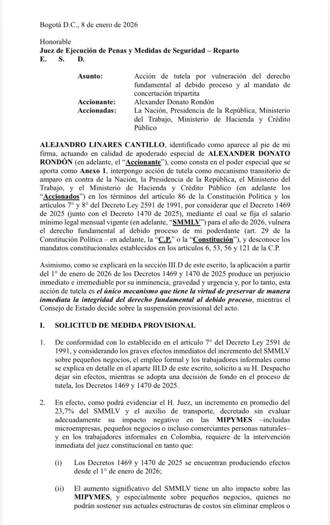 A estas acciones se suma la interposición de una acción de tutela que solicita la suspensión provisional de los decretos con los que el Gobierno fijó el aumento del salario mínimo para 2026. El recurso fue presentado por el exmagistrado Alejandro Linares, en calidad de apoderado .