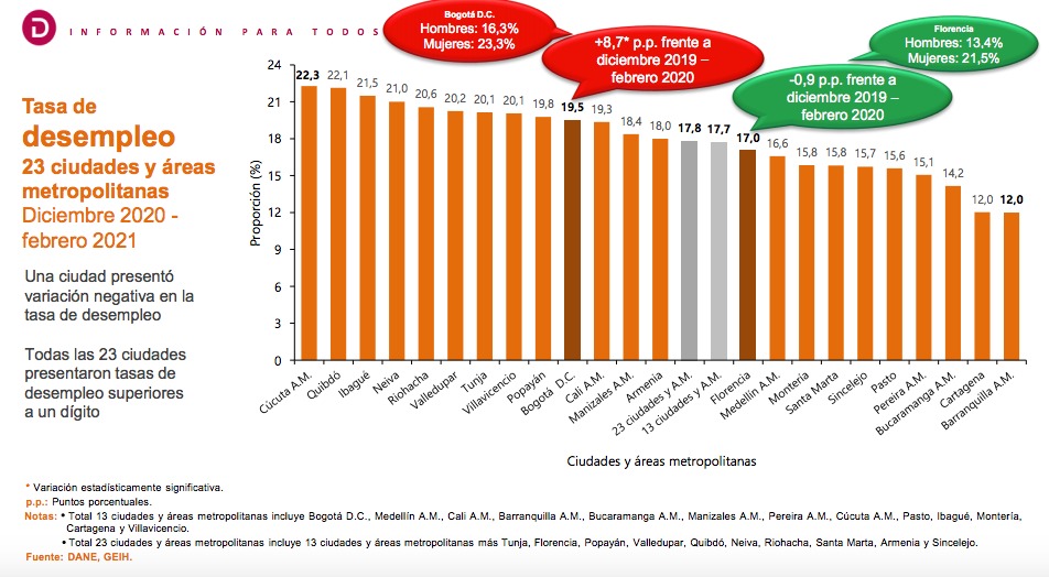 Las cifras reflejan el comportamiento del desempleo entre diciembre del 2020 y febrero del 2021. Ibagué solo fue superada por Cúcuta que marcó una tasa de desempleo del 22,3 por ciento y Quibdó con 22,1 por ciento.