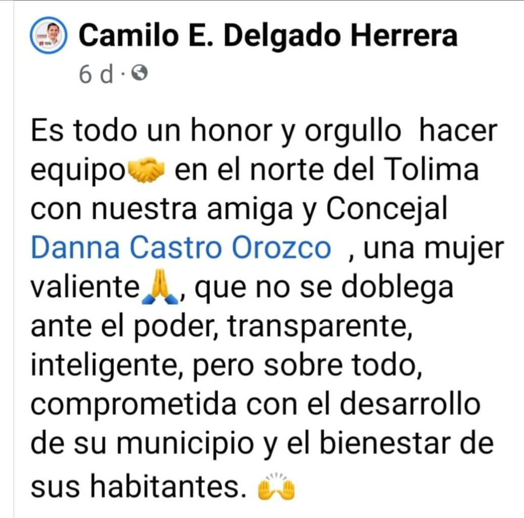 “Tal como aparece la foto y el mensaje, se presta para confundir a los electores”, aclaró Danna Castro. Hay que recordar que precisamente hace menos de 10 días, la concejal Danna le hizo en el Líbano una reunión al candidato Camilo Delgado.