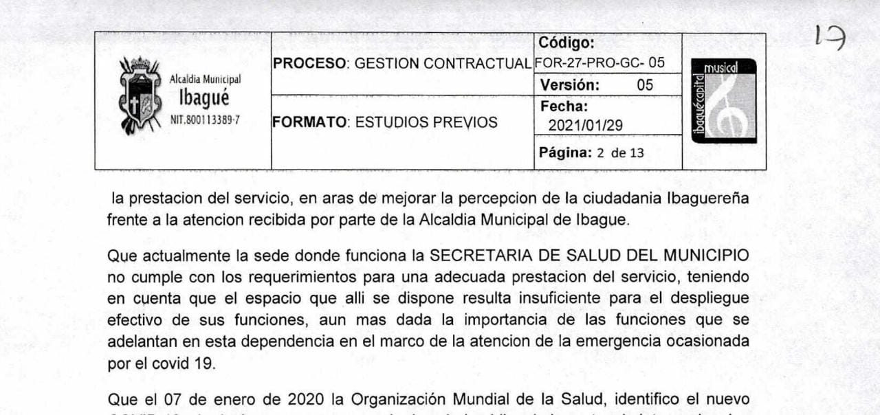“Actualmente la sede donde funciona la Secretaría de Salud no cumple con los requerimientos para una adecuada prestación del servicio, teniendo en cuenta que el espacio que allí se dispone resulta insuficiente para el despliegue efectivo de sus funciones, aun mas dada la importancia de las funciones que se adelantan en esta dependencia en el marco de la atención de la emergencia ocasionada por el covid-19”, se lee en el documento.