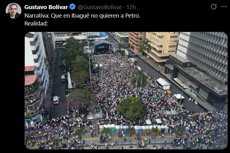 El lleno que presentó el Parque Murillo Toro dio para que los dirigentes políticos que hacen parte del Pacto Histórico, el partido de gobierno, salieran a reclamar que lo vivido en la capital del Tolima es una demostración de que el presidente Petro no está solo como lo pregona la oposición o que en Ibagué y el departamento no quieren a Petro. al respecto, el exsenador Gustavo Bolívar en su cuenta X escribió: “Narrativa: Que en Ibagué no quieren a Petro. Realidad: (muestra una panorámica del Parque Murillo Toro con lleno a reventar).