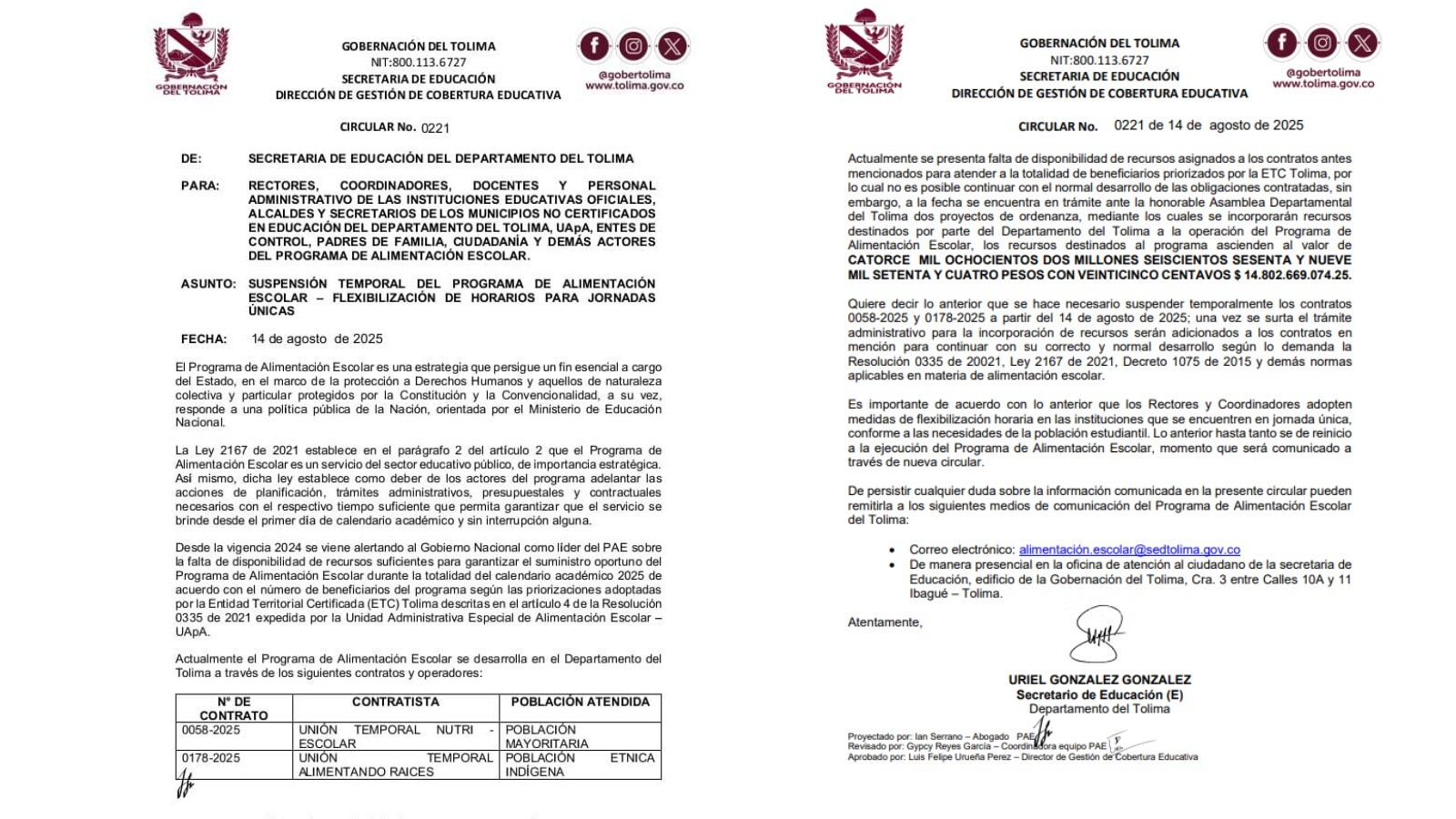 El Programa de Alimentación Escolar (PAE) fue temporalmente suspendido en el Tolima, debido a falta de recursos, según informo la Secretaría de Educación a través de la circular Circular No. 221 con fecha del 14 de agosto de 2025.