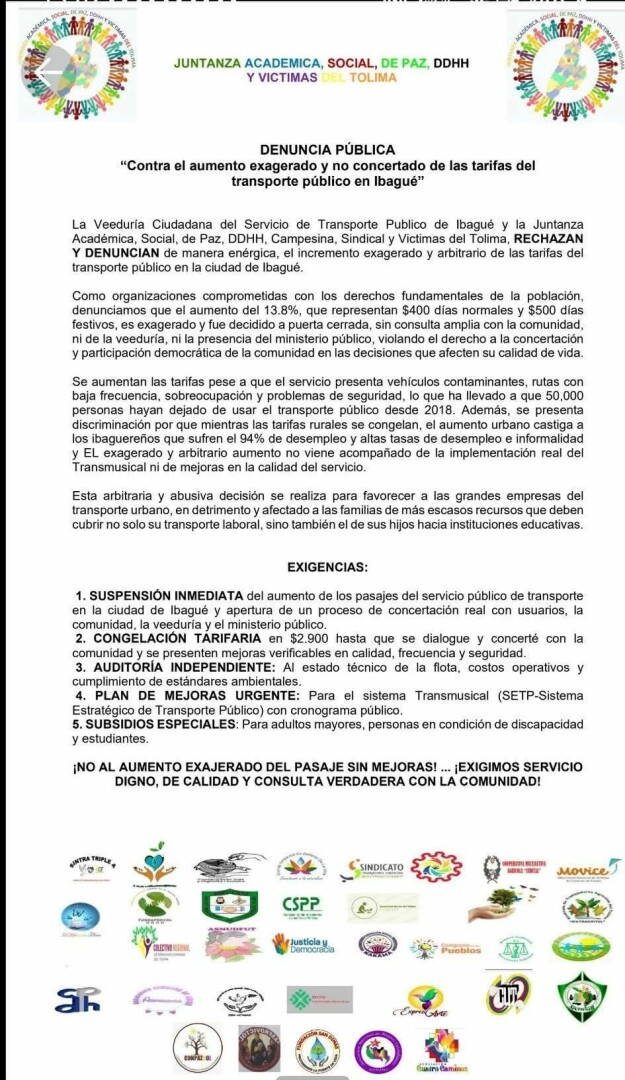 A través de un comunicado, la Veeduría Ciudadana del Servicio de Transporte Público de Ibagué y la Juntanza Académica, Social, de Paz, Derechos Humanos, Campesina, Sindical y Víctimas del Tolima se pronunciaron en contra del aumento en la tarifa del transporte público en la capital tolimense.