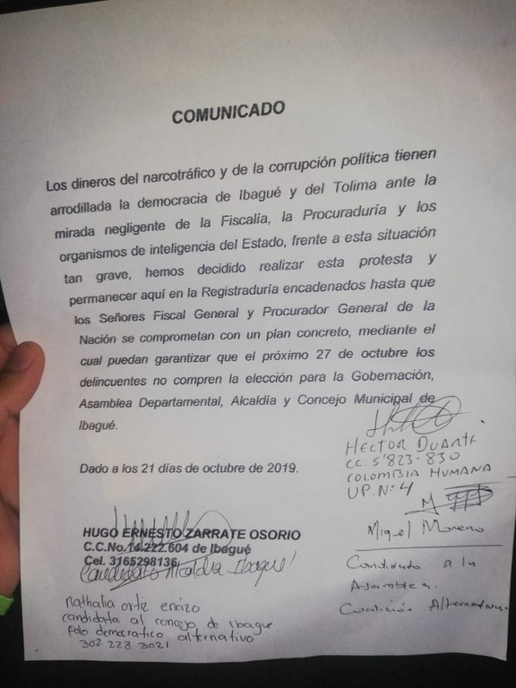 Igualmente el comunicado manifiesta que "hemos decidido realizar esta protesta y permanecer aquí en la Registraduría encadenados hasta que los señores Fiscal General y Procurador General de la Nación, se comprometan con un plan concreto mediante el cual puedan garantizar que el próximo 27 de octubre los delincuentes no compren la elección para la Gobernación, Asamblea Departamental, Alcaldía y Concejo Municipal de Ibagué".