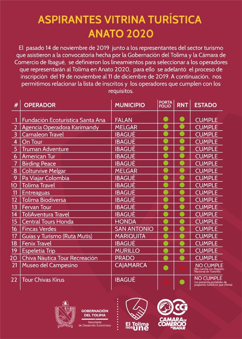 La Cámara de Comercio de Ibagué de forma articulada con la Gobernación del Tolima, hacen posible que empresarios del sector turismo hagan presencia en la versión número 39 de la vitrina más importante del turismo en el país como es la Feria de Anato, que se realizará los días 26-27 y 28 de febrero próximo en Corferias Bogotá.