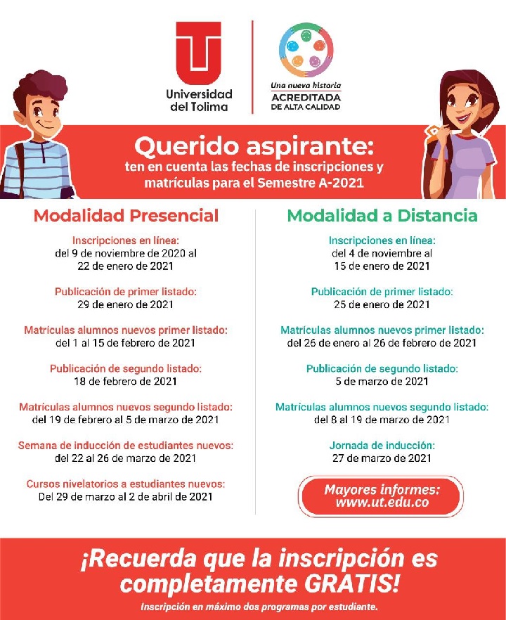 La Universidad del Tolima publicó el cronograma para el registro e inicio del semestre A 2021, tanto en modalidad presencial como a distancia.