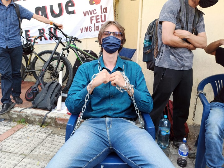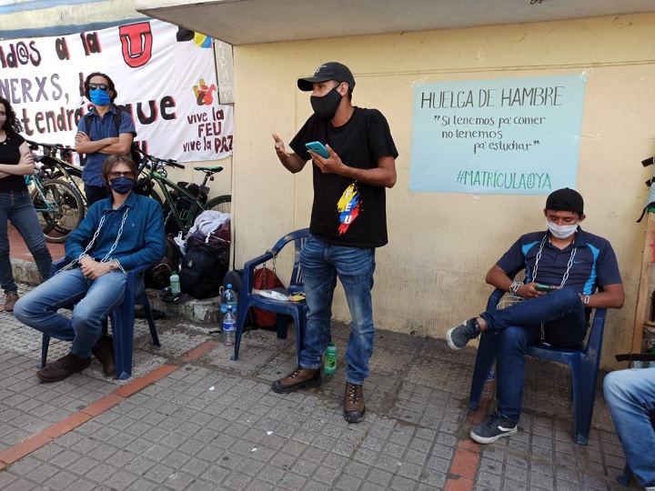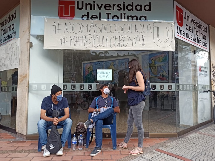 Uno de los huelguistas es Juan Carlos Galindo de 31 años de edad, estudiante de Licenciatura en Ciencias Sociales, quien cursa noveno semestre. Él es representante estudiantil al Consejo de la Facultad de Ciencias de la Educación y miembro de la Federación de Estudiantes Universitarios de Colombia (FEU). "A nivel nacional se ha venido levantando esa bandera de Matrícula Cero y aquí no ha sido la excepción. Sabiendo que la mayoría de las familias trabajan en la informalidad, si no tienen para comer en estos momentos a raíz de la pandemia, menos para pagar la matrícula de sus hijos, lo que podría generar una deserción grandísima", explica el estudiante oriundo de El Espinal.