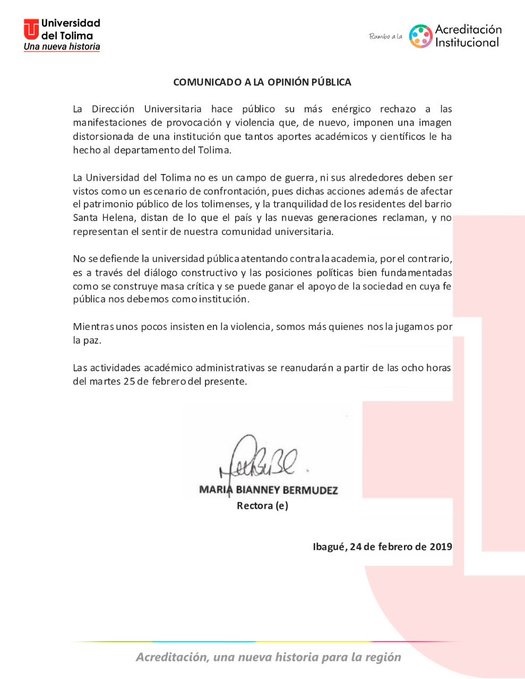 El comunicado firmado por la rectora encargada María Bianney Bermúdez, señala además que “Mientras unos pocos insisten en la violencia, somos más quienes nos la jugamos por la paz".