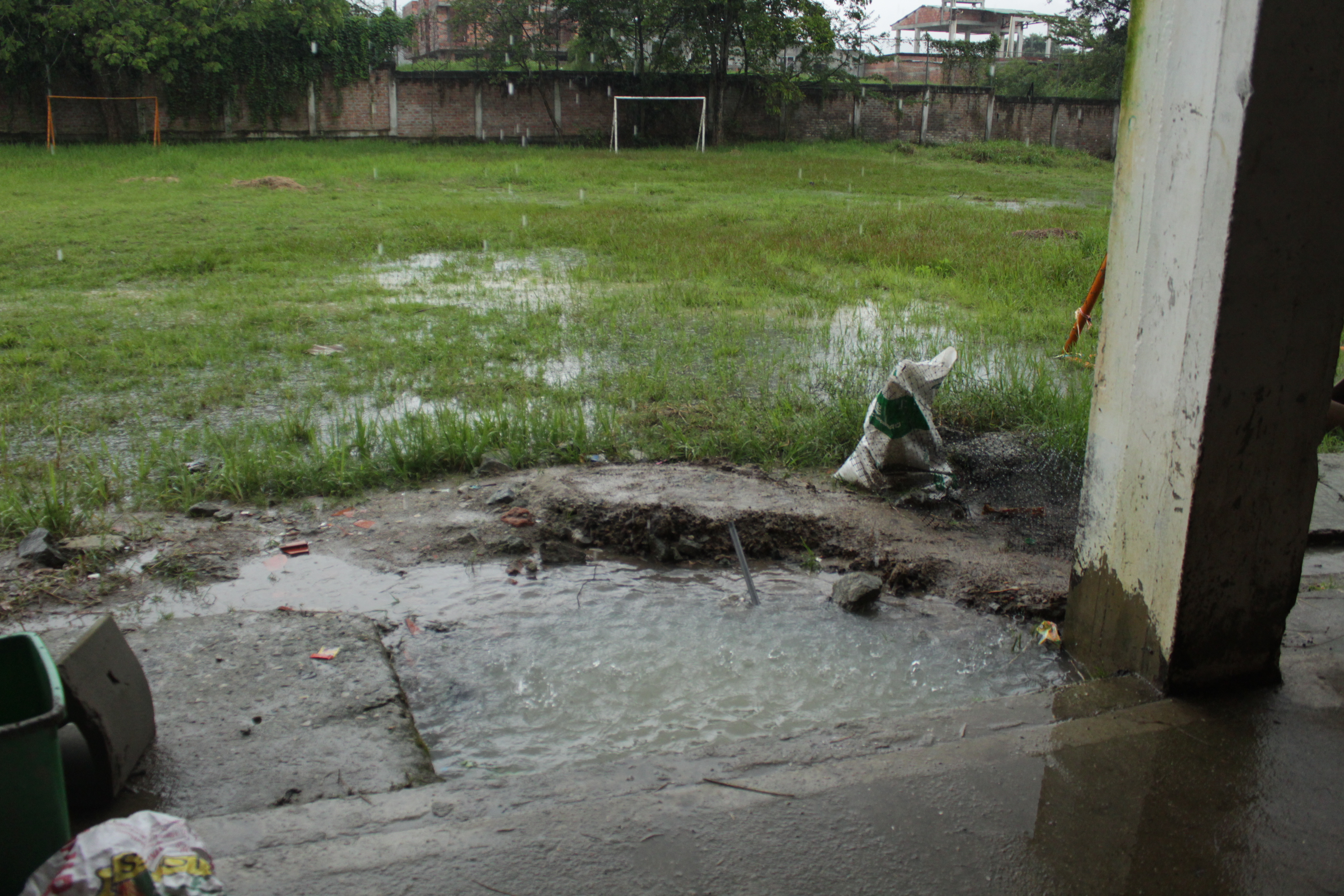 Los días más difíciles para la comunidad educativa se viven en la temporada de lluvias, debido al daño causado al sistema de drenaje, el agua que cae desde la Ceiba Norte, llega hasta las aulas de clase y termina en el barrio Los Lagos.