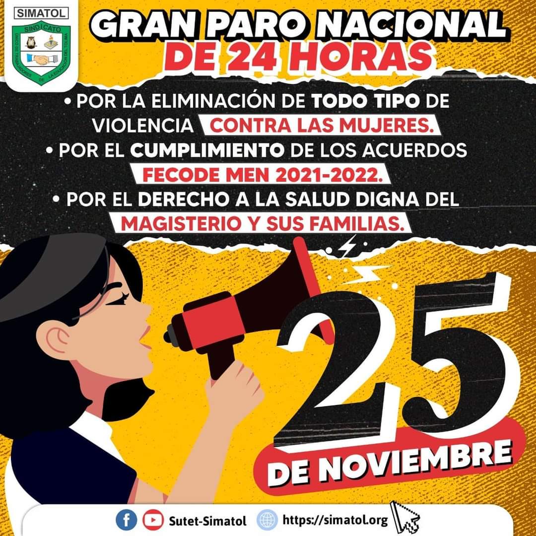 Por consiguiente, para los trabajadores de la educación habrá paro de 24 horas el próximo jueves 25 de noviembre. Entre las actividades anunciadas, se prevé un plantón cultural y pacífico en la plazoleta Darío Echandía, en pleno centro de Ibagué. Allí la jornada iniciará sobre las 8:00 de la mañana.
